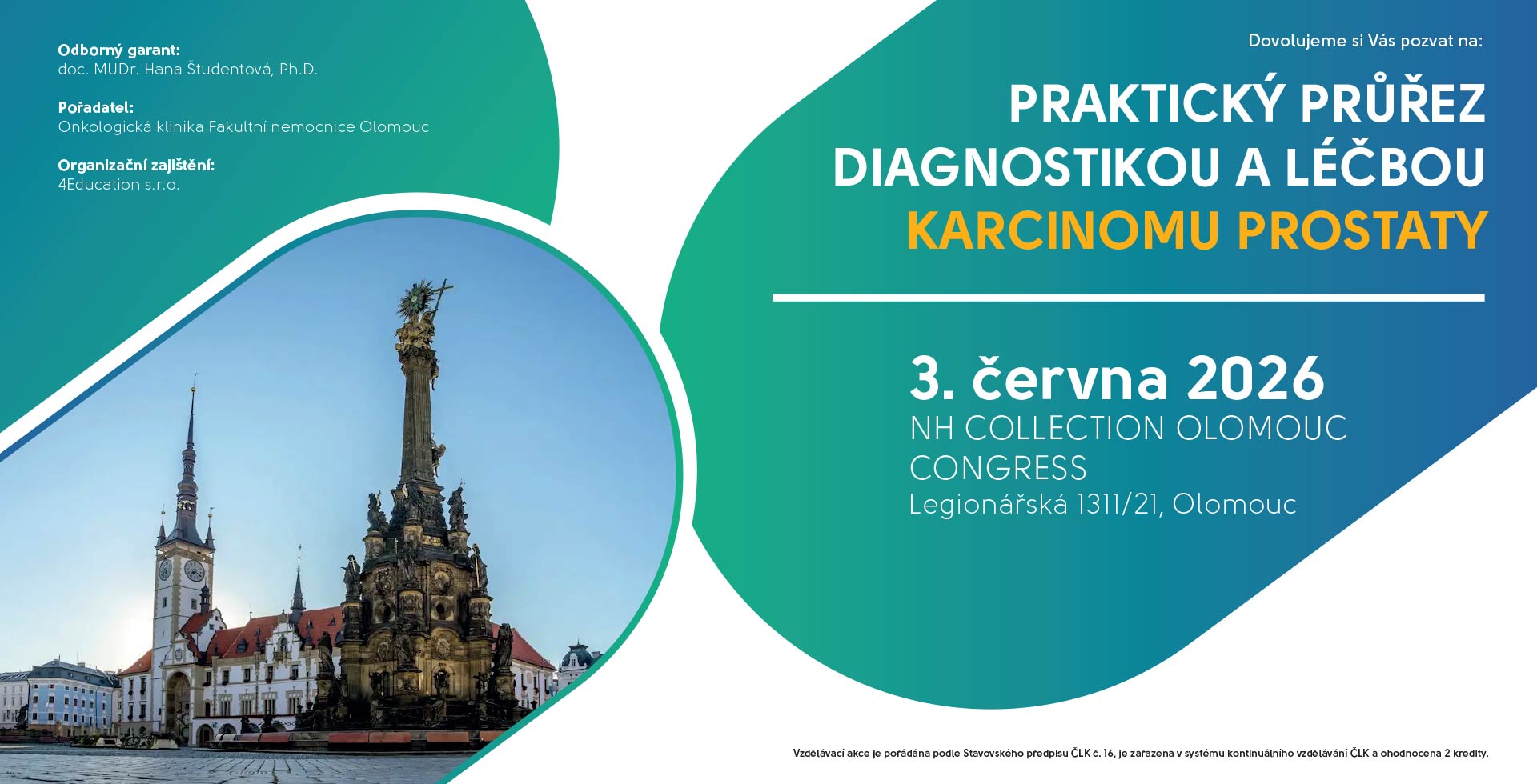 Zaškrtnutím tohoto pole vyjadřujete svobodný a vědomý souhlas pořadateli akce „Praktický průřez diagnostikou a léčbou karcinomu prostaty, 03. 06. 2026, Olomouc“, kterým je společnost 4Education s.r.o., se shromažďováním, zpracováním a uchováním svých osobních údajů v rozsahu zadaném ve formuláři. Ochrana osobních údajů odpovídá zákonu č. 101/2000 Sb. a požadavkům nařízení EU 2016/679 (GDPR).